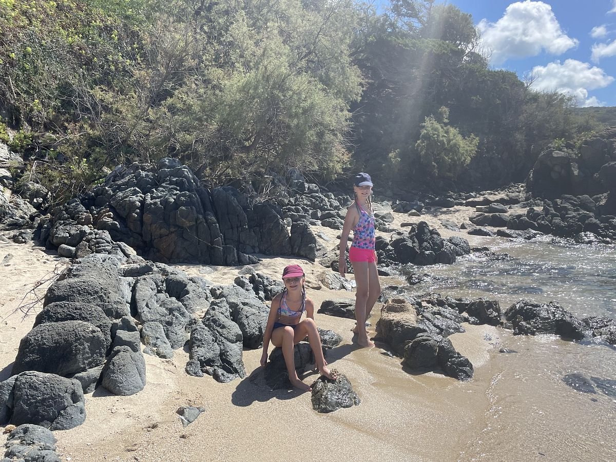 Užili jsme si šnorchlování, Izí brýle skoro nesundala 😂 Holky společně ještě postavily hotel na kamenech pro panenky, které si dovezly z Čech. David si užil vodu a šnorchl, nechal si ožírat nohy od rybiček a odpočíval 👍. Marťa si mohla v klidu číst na pláži u vody, na kamenech, pod stromem…no skoro všude 🤣 jako kámošky na čtení měla ještěrky, včetně jedné, co vypadala, že ji zabaví knížku 😂 a šnorchlovala a taky plavala, ale jen do doby než ji dvě ryby ji okousaly odřenou část nohy, tak rychle, že do vody pak už skoro nechtěla 🤣