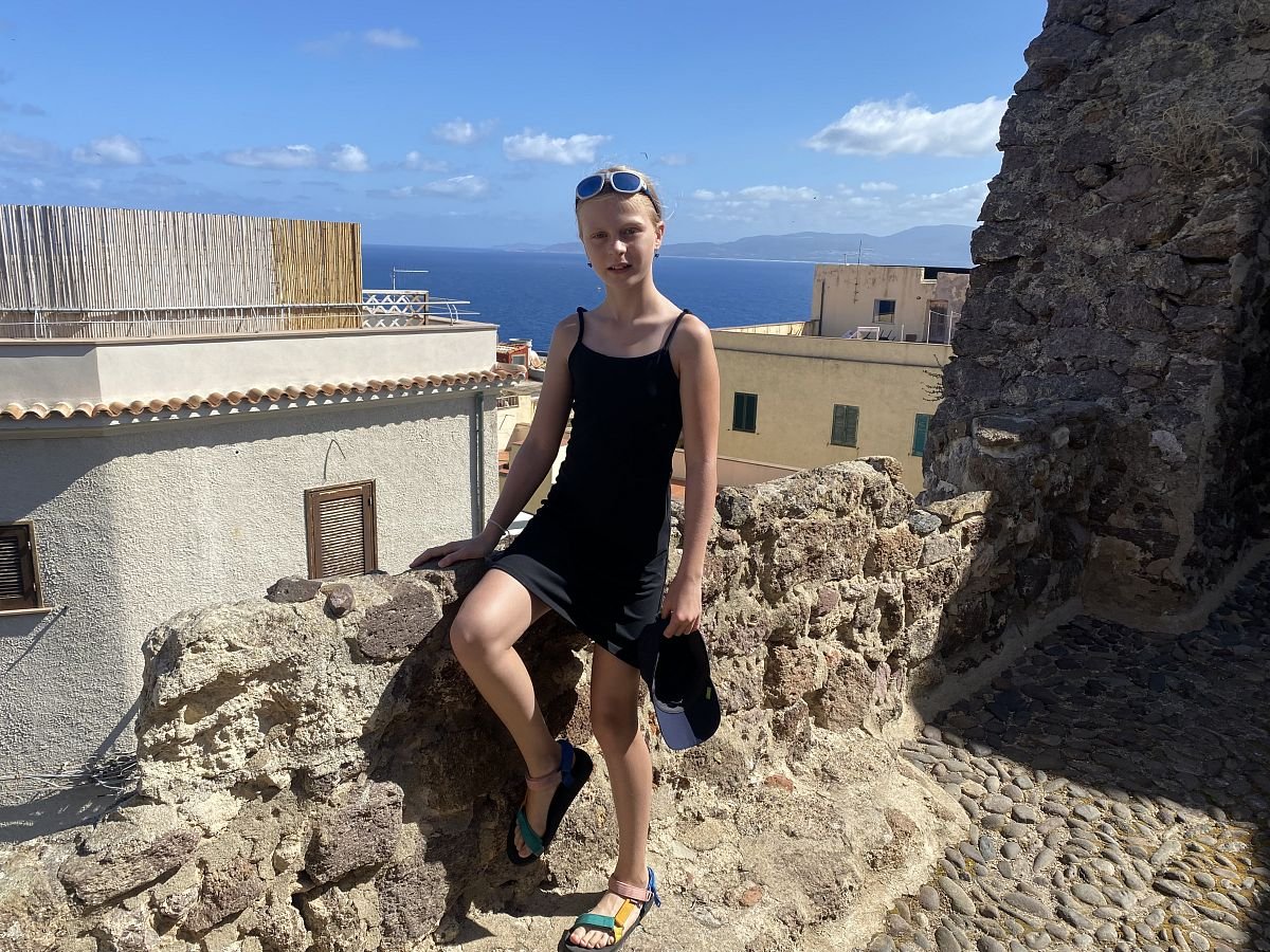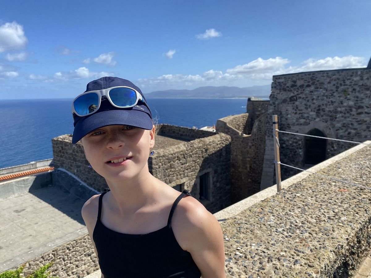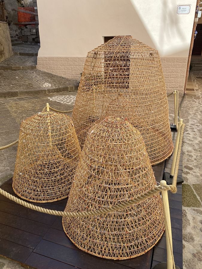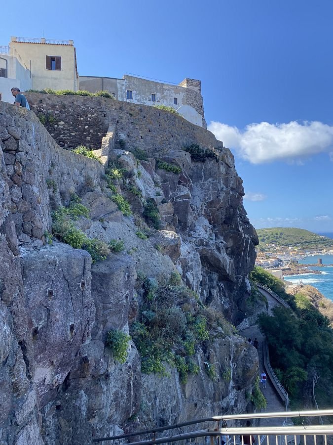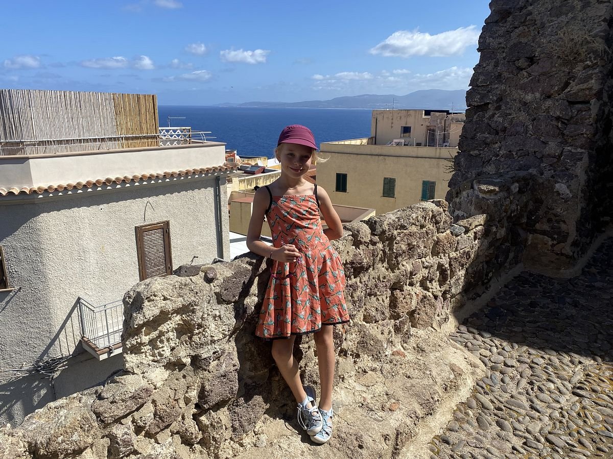 Cesta byla cca 55 km a hodinka času. Místo zajímavé. Zaparkovali jsme v horní části města, zjistili jak funguje parkování přes EasyPark a vyrazili vzhůru na hrad. Po zaplacení vstupného 5€ za dospělého a 4€ za děti jsme si ho šli prohlédnout. Expozice byly věnované primárně tradičním proutěným výrobkům a klecím na rybolov, který je na Sardinii tradiční.