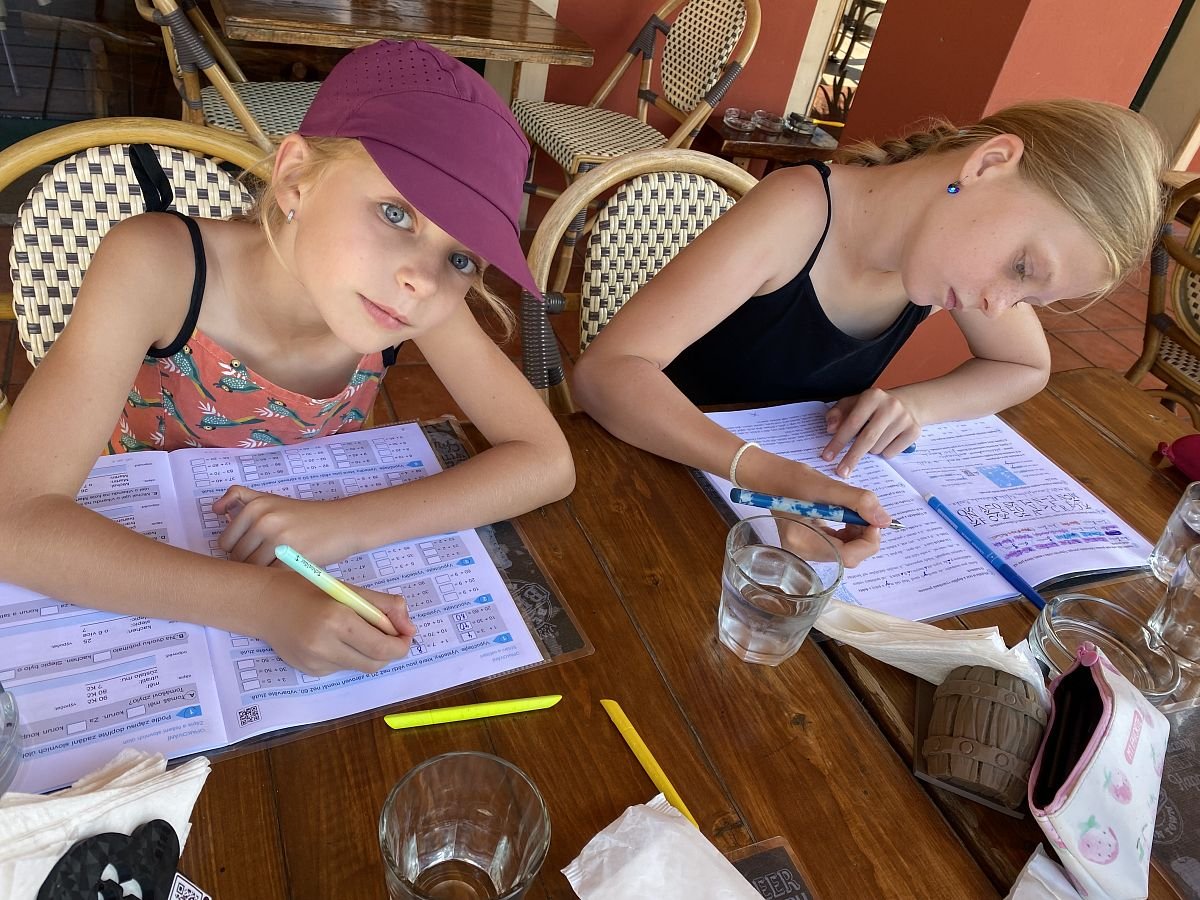 Z první pizzerky nás vyhodili, že je jen pro ubytované v kempu, v druhé jsme nepochodili, protože pizzu dělají až večer. A ve třetí jsme si konečně sedli a vybrali skvělou pizzu. Při čekání na ni si holky udělaly nějaké věci do školy.