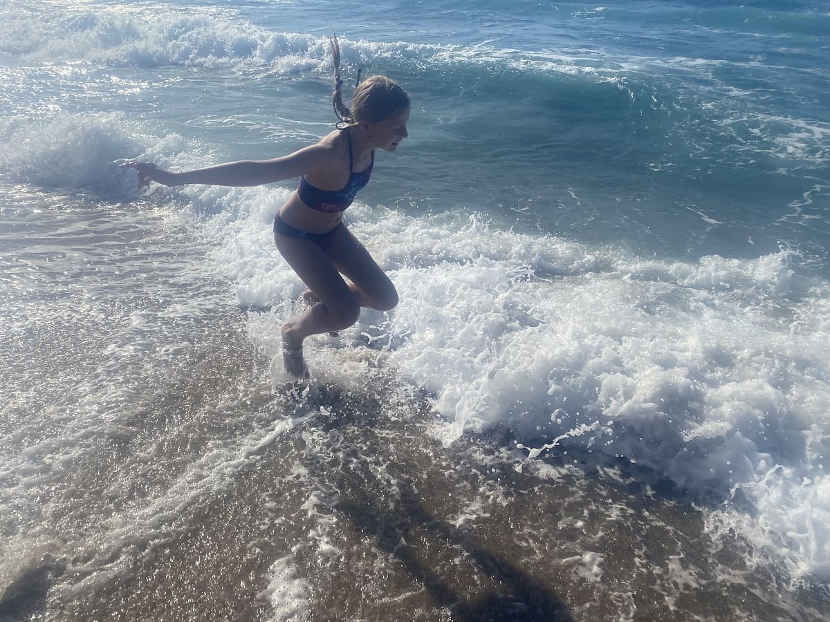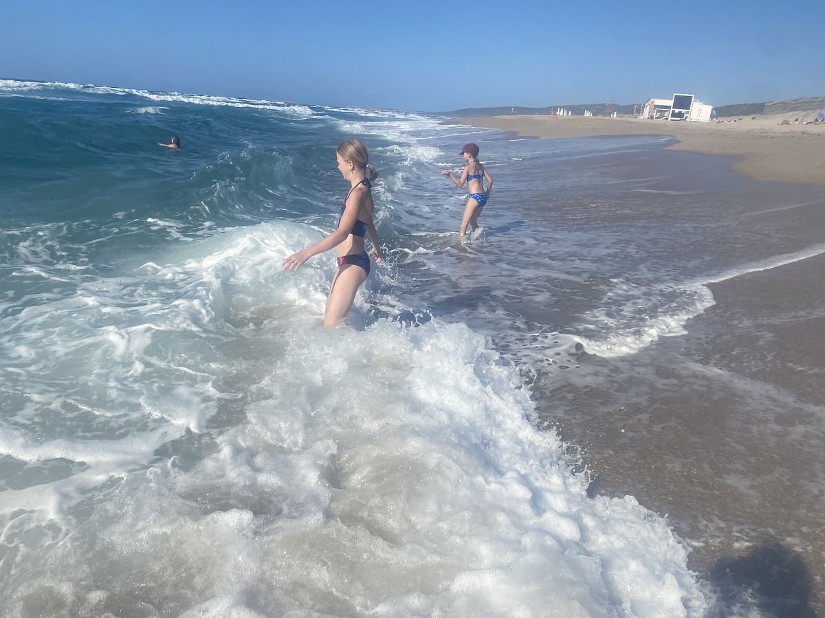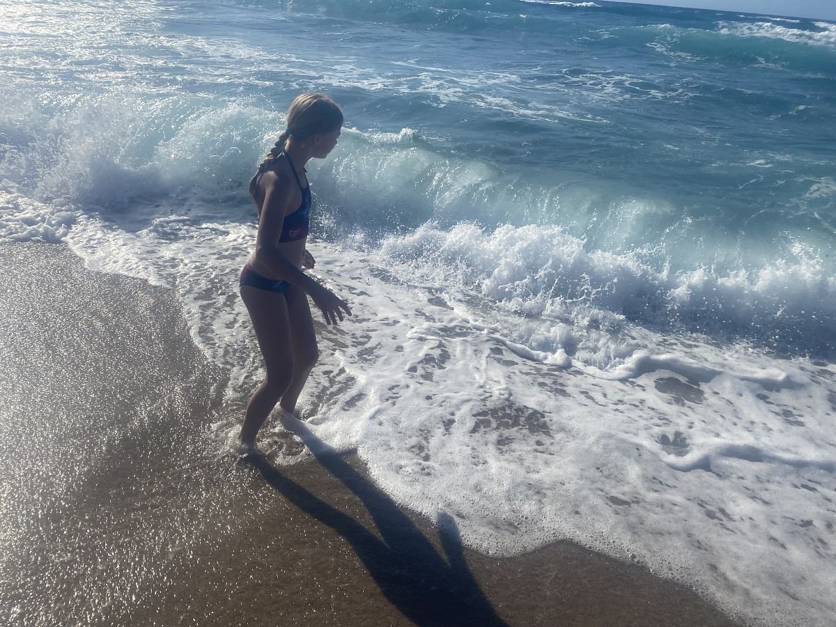 Po jídle jsme konečně vyrazili směr pláž Pultu Biancu. Bylo to kousek. Když jsme míjeli první parkoviště, bylo zavřené. Druhé vedlo kamsi náhoru a dle Mapy.cz bylo jedno přímo u pláže. Jeli jsme se tam podívat. Na parkovišti pár aut. Nic neobvyklého ikdyž vlála červená vlajka. Tak jsme zaparkovali a šli obhlédnout situaci. Vlny byly celkem velké, tak jsme jen blbli na kraji, protože do vody se nesmělo. Ale i tak to bylo skvělý. Fajn den na oslavu narozenin, na pláži s námi se všemi. ☺️🥰