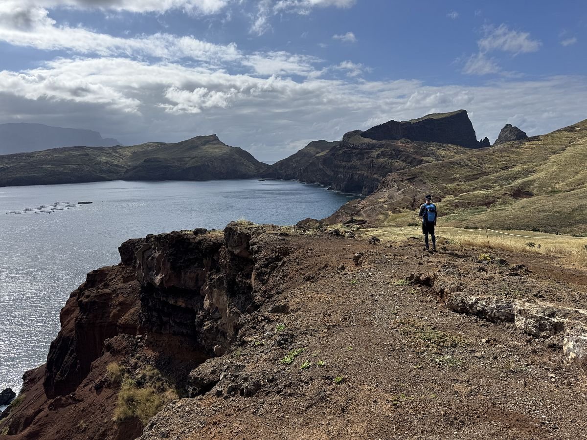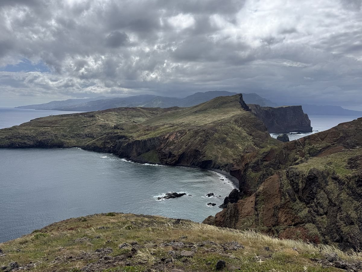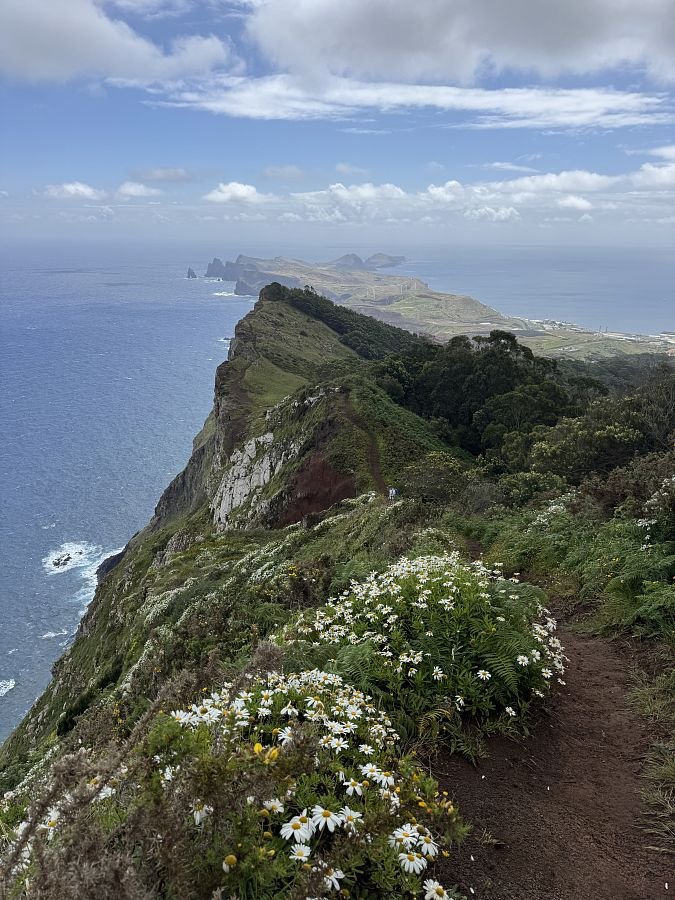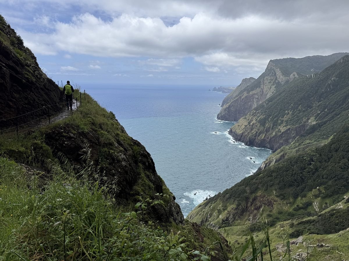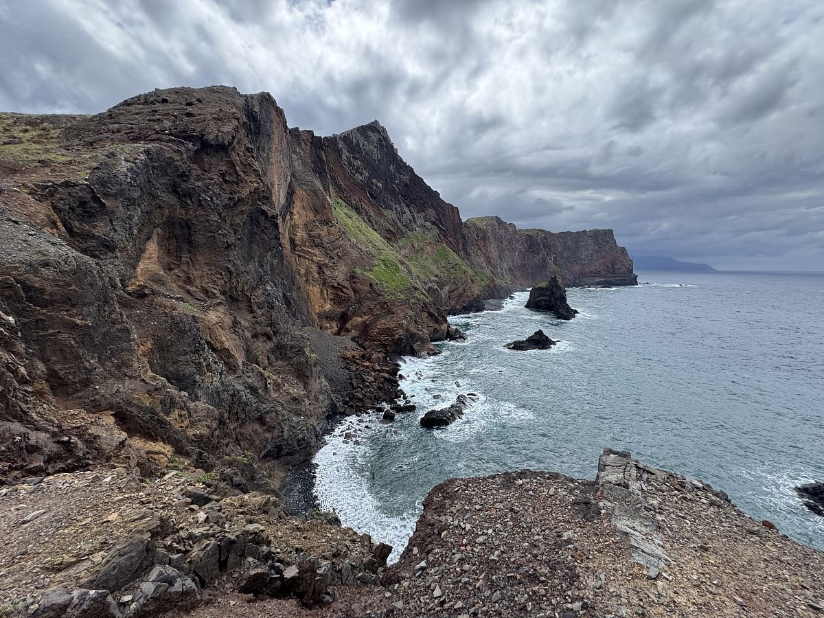 Parkujeme zdarma u hřbinova v Caniçal, odkud trasa začíná. Kubovi se moc nelíbí profil na mapách a tak začátek obcházíme a Terce se to nelíbí (PS později jiný den jsme se tam vrátili a nakonec všechno super). Připojujíc se na cestu o kus dále se nám otevírá krásný výhled na útesy i východní výběžek Madeiry - Ponta Saõ Lourenço.