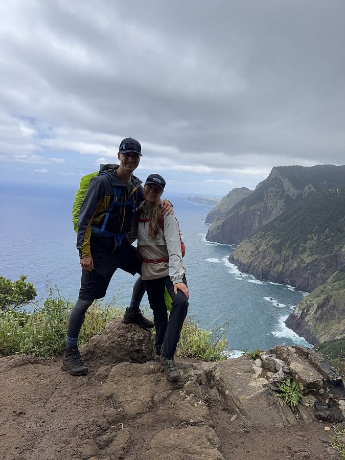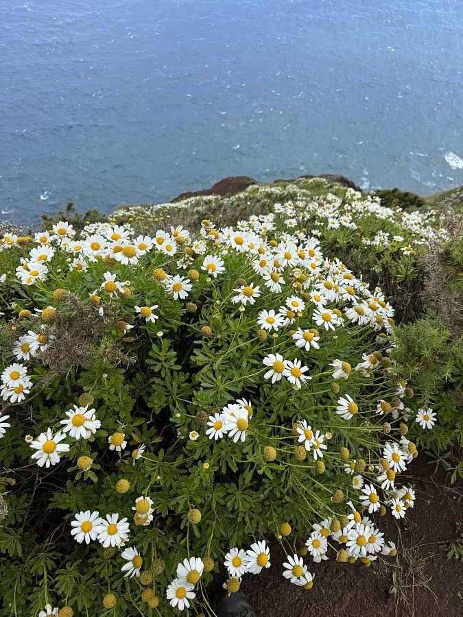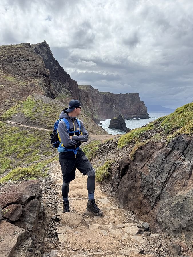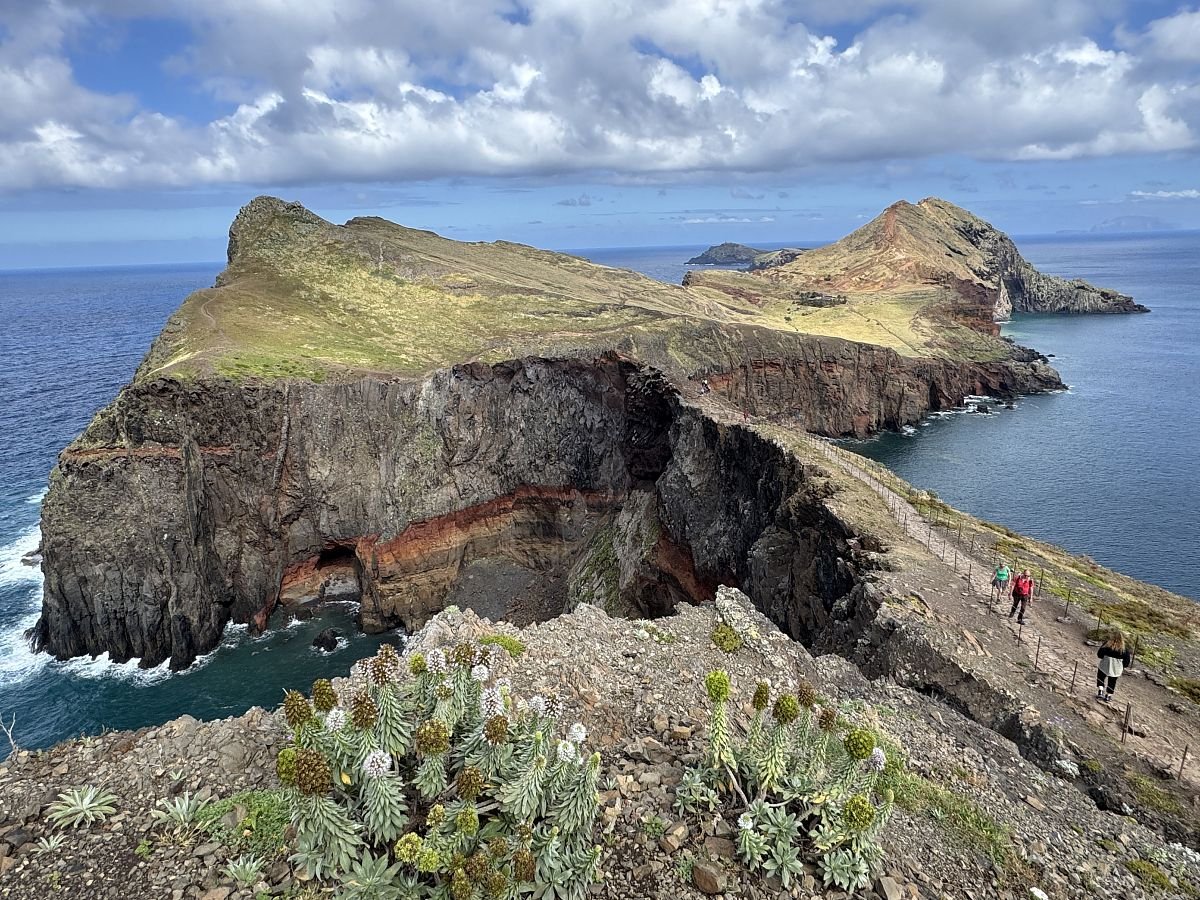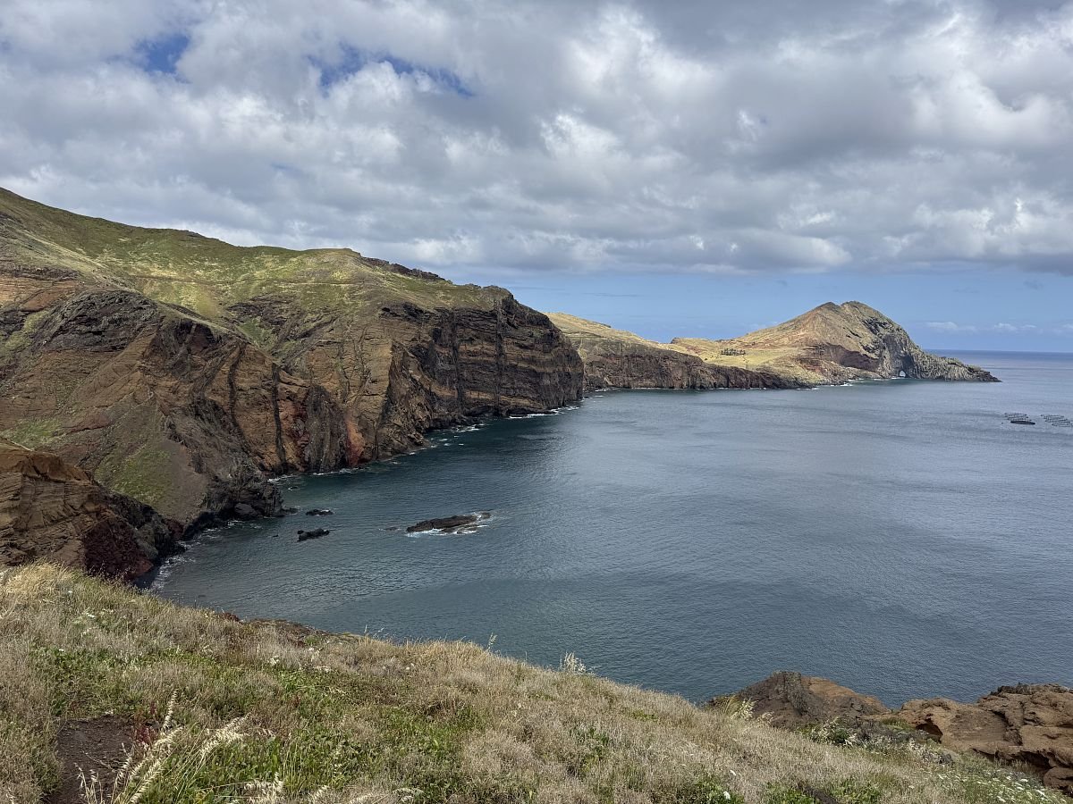 Parkujeme zdarma u hřbinova v Caniçal, odkud trasa začíná. Kubovi se moc nelíbí profil na mapách a tak začátek obcházíme a Terce se to nelíbí (PS později jiný den jsme se tam vrátili a nakonec všechno super). Připojujíc se na cestu o kus dále se nám otevírá krásný výhled na útesy i východní výběžek Madeiry - Ponta Saõ Lourenço.
