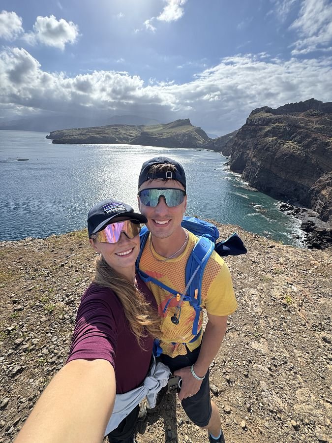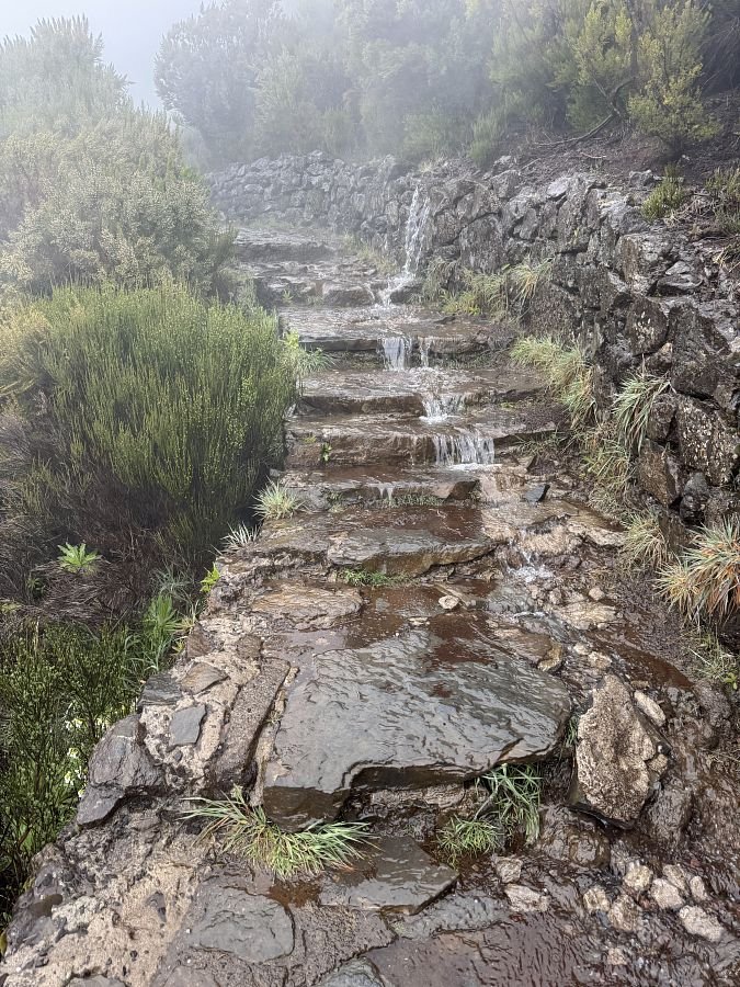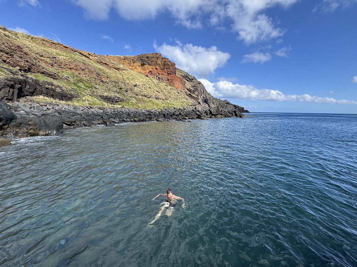 Po necelých 4,5 hodinách a asi 12 km od úplného začátku jsme na konci značené cesty. Podle mapy kousek od města Porto da Cruz, odkud jsme chtěli jet busem nebo taxíkem. Realita je ale taková, že centrum města je sice vzdušnou čarou asi 2km, ale asi 350 výškových metrů pod námi s klikatou cestou. Po našem výkonu jsme celkem uťapkaní a tak se díváme, zda tu jezdí Bolt. Jezdí! A Uber taky! A je levnější. Scházíme asi 10 min na hlavnější silnici, abychom redukovali náklady a voláme Ubera. Do 10 min máme potvrzeného řidiče a za dalších 15 min nás vyzvedává místňák v Dacii.