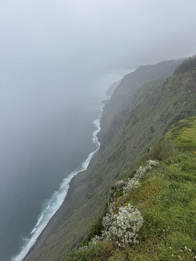 Další cesta vede na jinou vyhlídku - Miradouro do Ponta do Pargo, na které jsme si chtěli dát oběd. Je totiž 13:30. Balíme potřebné věci do batůžku a vyrážíme ke stolečku asi 300m. Přesně ve chvíli, kdy jsme tam dorazili, přišel mrak a začalo pršet. Otáčíme to a běžíme zpět do auta. Nevyhnuli jsme se tak obědu v autě.