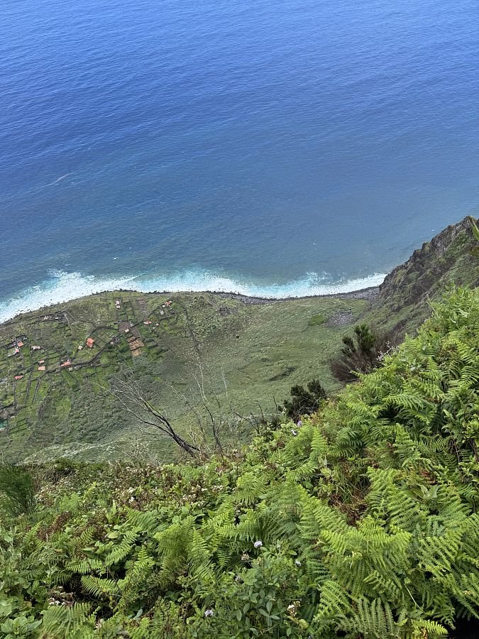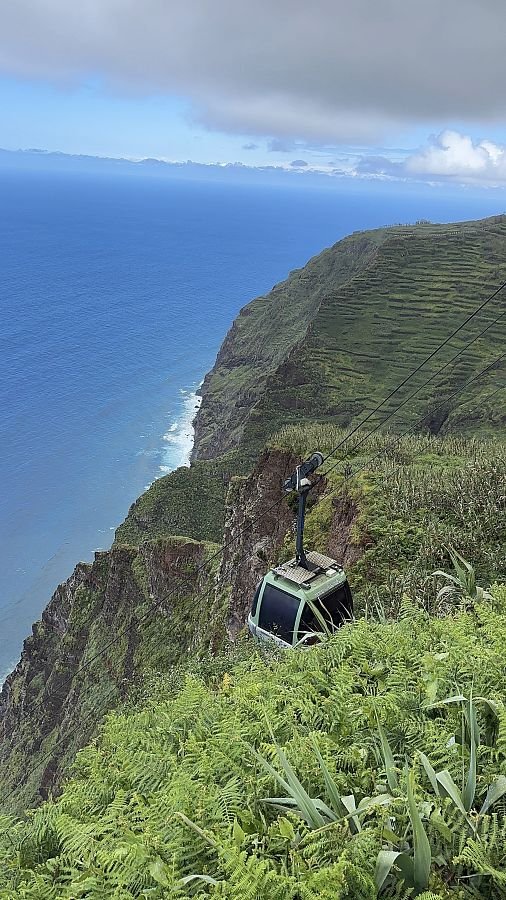 Na rozdíl od ostatní se jdeme jen podívat na lanovku z horní stanice jak vypadá. Je to děsivé - jezdí pouze dvě proti sobě, cena 2€ za osobu a všichni čekají frontu. Nám se to nelíbí a spodní část u moře nenabízí nic extra. Tak fotíme a vracíme se k autu, přičemž popojíždíme asi 10 minut k vyhlídce Miradouro da Ponta da Ladeira, ze které je lanovka vidět celá z jiného úhlu. Je to impozantní, ale děsivé.
