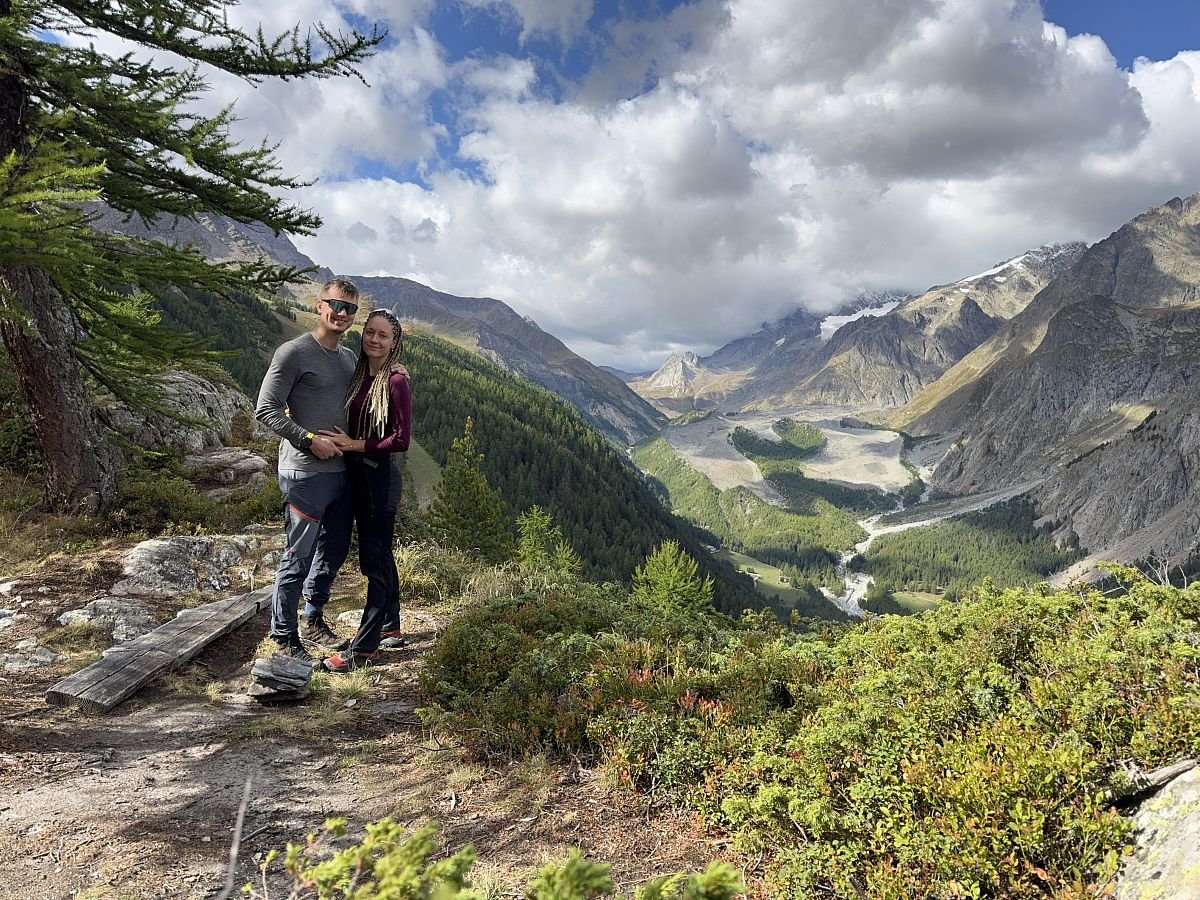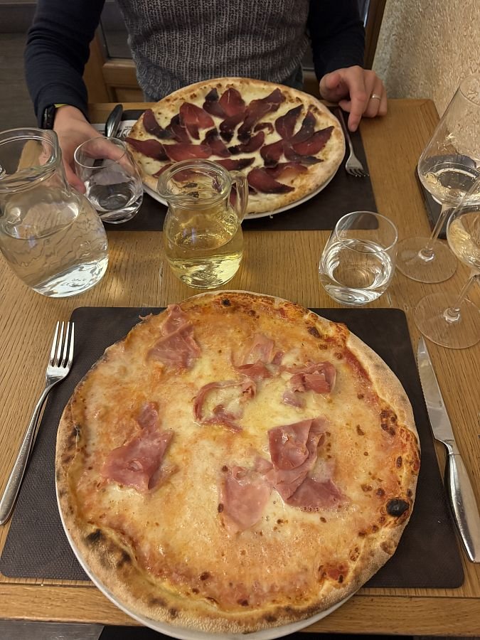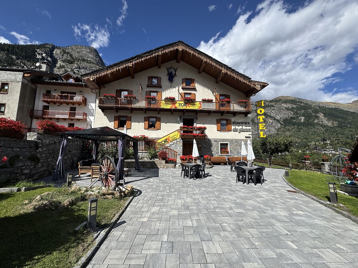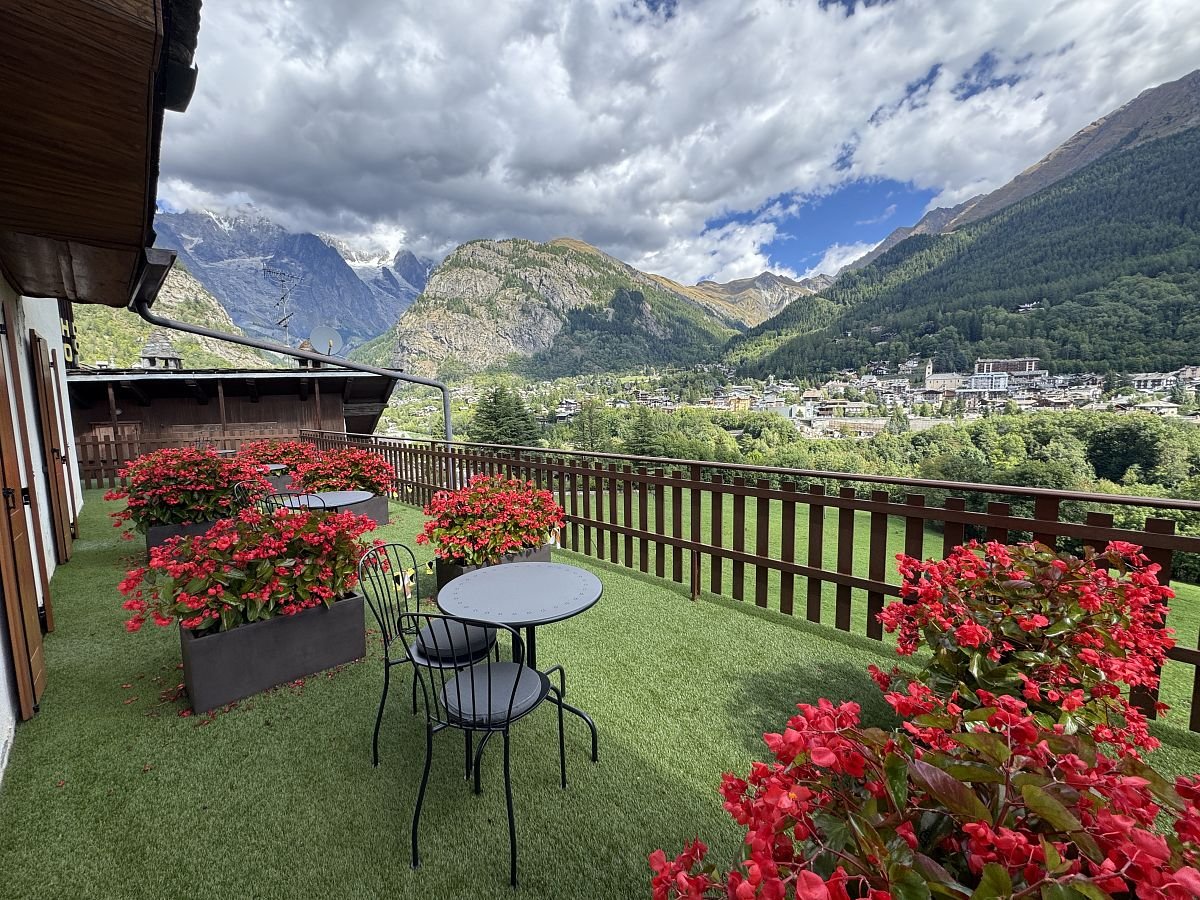Kolem 13h přicházíme k našemu ubytování - Hotelu Des Glaciers, kde nás na recepci přivítá příjemná paní a říká, že náš pokoj je už přichystaný, ikdyž jsme tu o hodinu dříve. Natěšeni běžíme do našeho pokojíku, kde nás čeká milé překvapení v podobě přání k našemu prvnímu výročí svatby a italské sušenky… což je moc příjemné! Dalším překvápkem je nádherná teráska s ještě krásnějším výhledem na okolní hory a město. No jsme víc než spokojeni! Ale samozřejmě oba se už moc těšíme do teplé sprchy v teplém prostředí, kterou si taky hned dosyta užíváme! Pak oddychujeme chvíli na balkoně, uděláme k obědu další dehydrované jídlo a vyrážíme do města!