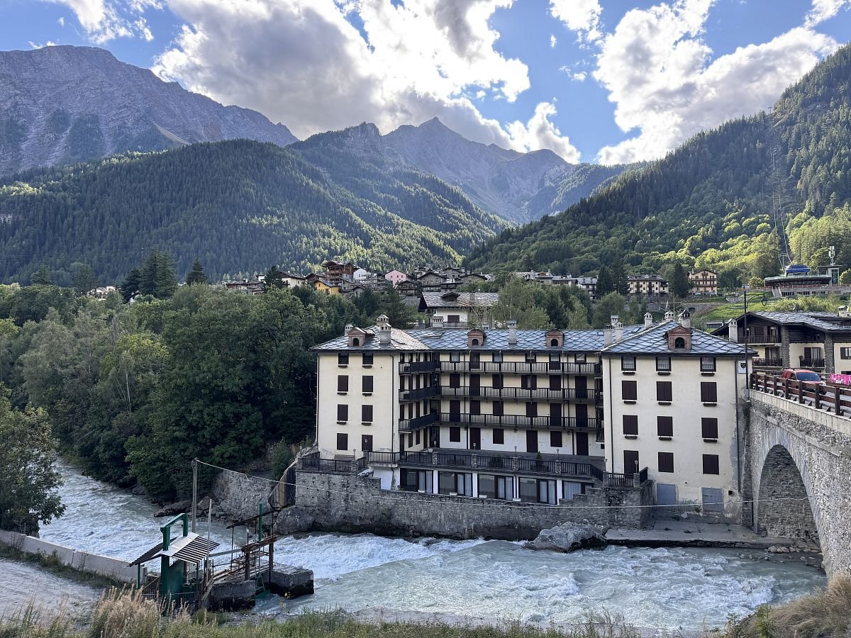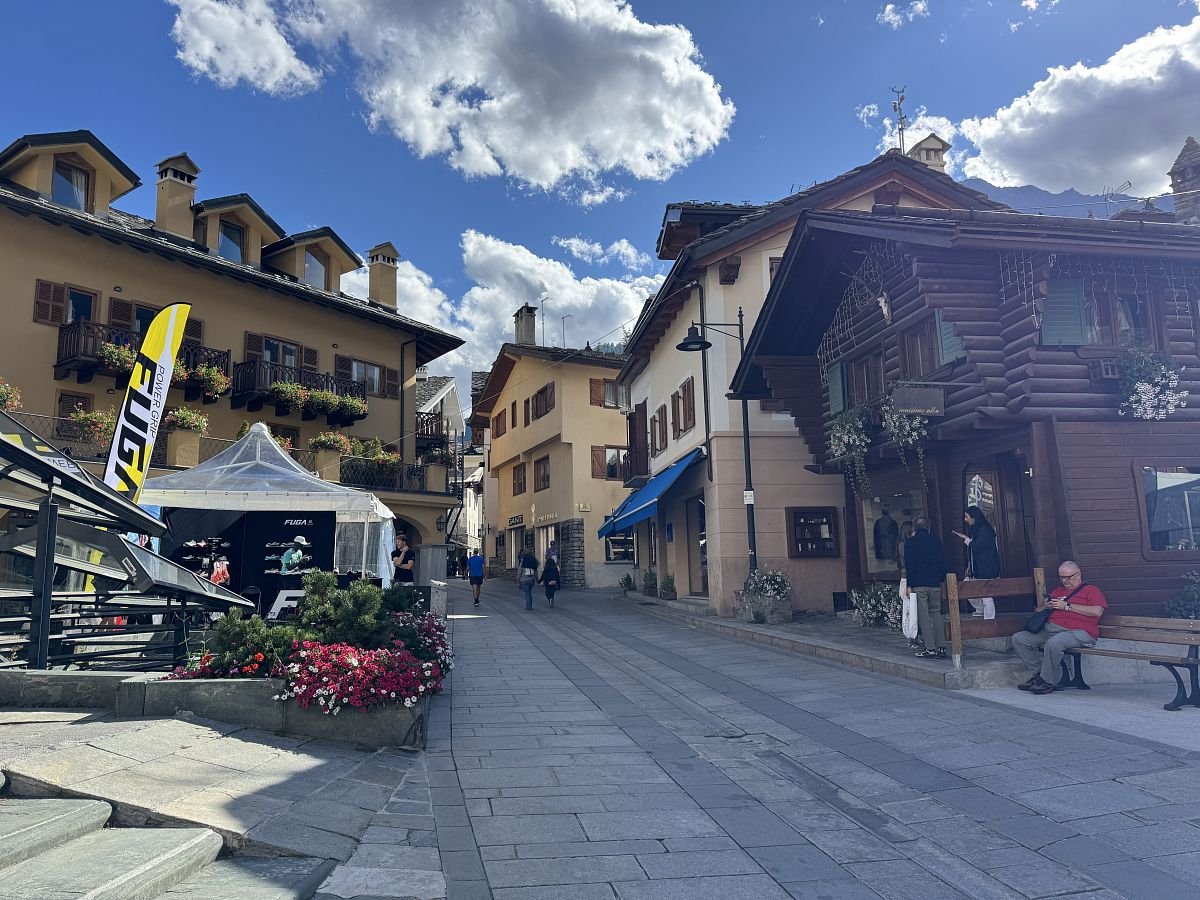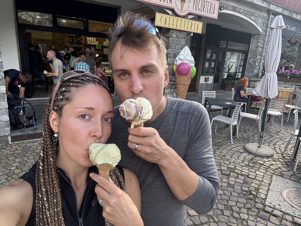 Do centra je to sice dál než jsme čekali, ale máme čas a chůze bez batohu je jak pírko, takže nám to vůbec nevadí! Procházíme uličkama Courmayeru až do vzdálenější kavárny ARTST Pasticceria Courmayer, kde si dáváme capuccino, aperol a Kuba nakonec i sladký Croissant s čokoládou. Odpočíváme a pak procházíme město zpět, nakukujeme do různých sportovních obchůdků a před kostelem si pak ještě kupujeme zmrzku, když už jsme v té Italii a je i vedro!