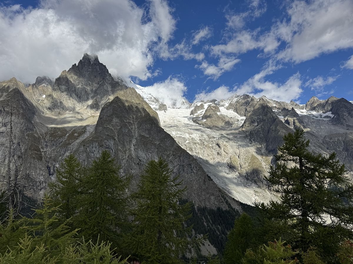 Pomalu vše sbalíme a vyrážíme přímo z kempu do prudkého kopce. Dnes nás nečeká nic dlouhého a tak jdeme na pohodičku. Šplháme chvilku po sjezdovce, chvilku turistickou cestou a dostáváme se na vrcholek poblíž chatě Refugio Maison Vieille. Terka by chtěla ale vidět lepší výhled a tak jdeme ještě kus do kopce na vrcholek Tete Neyron, kde si sedáme a kocháme pohledem na Mont Blanc.