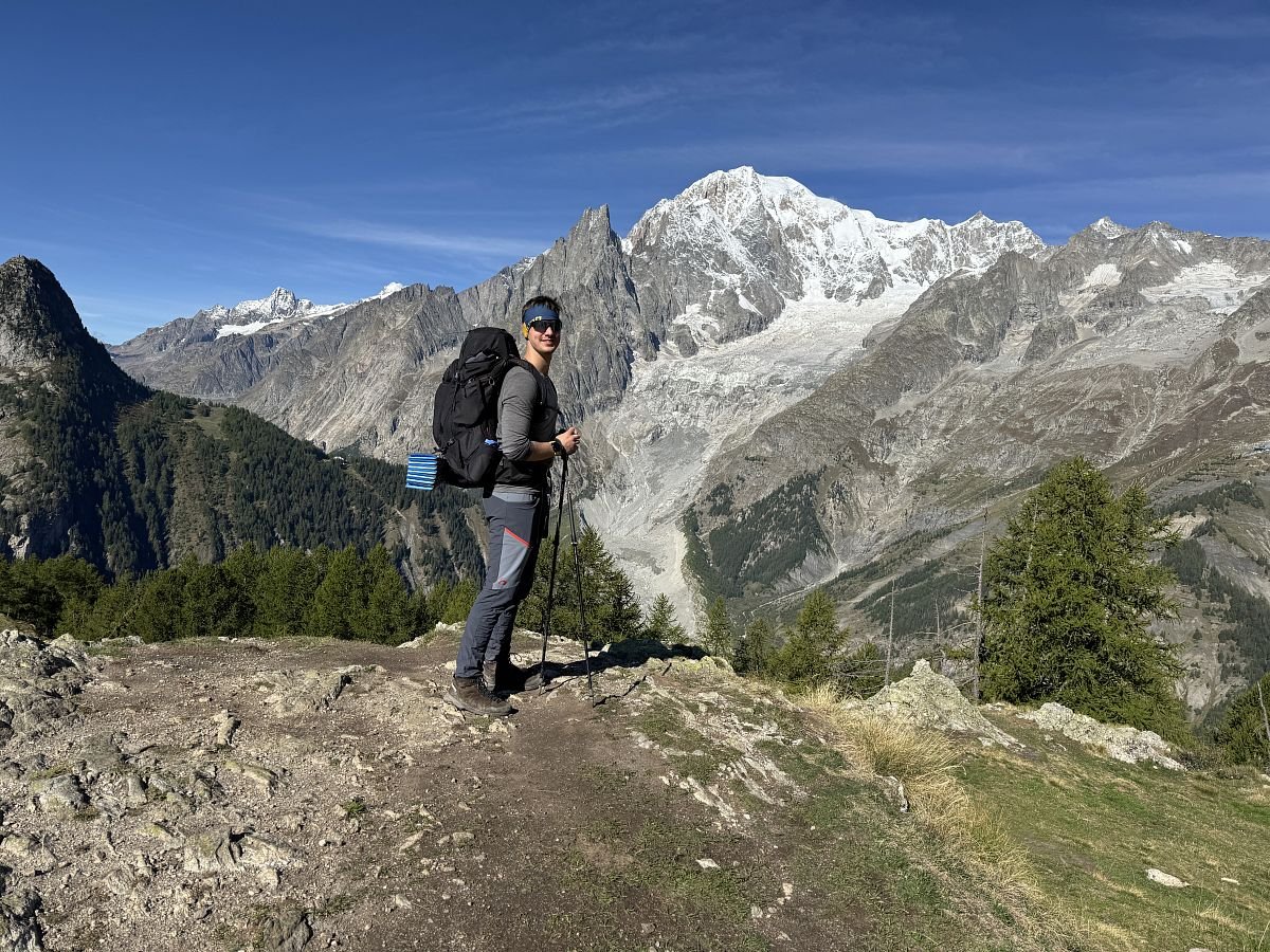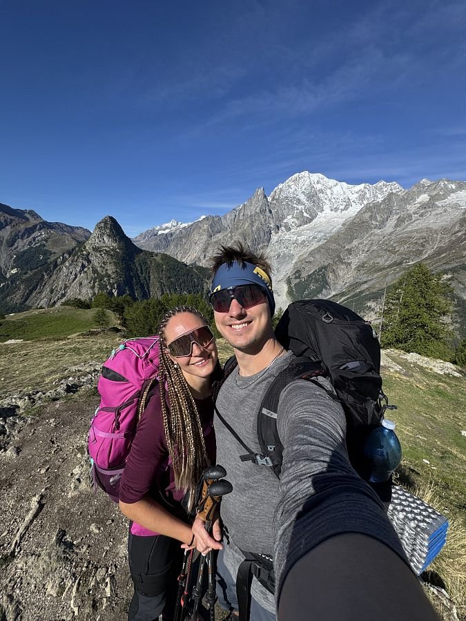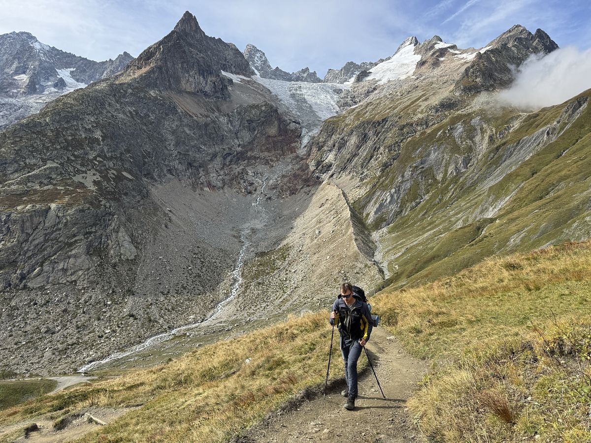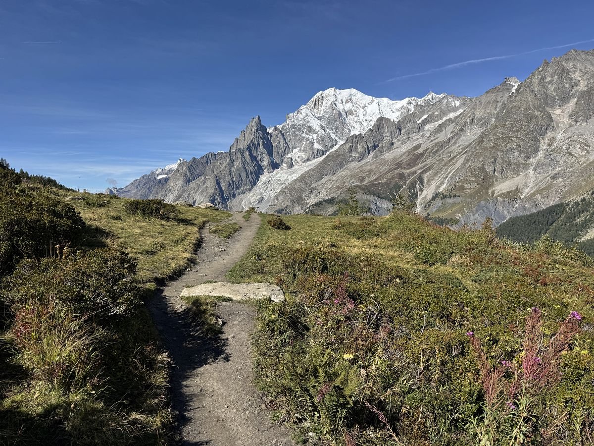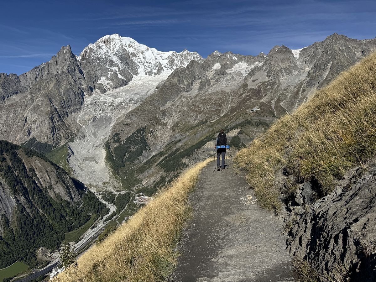 Za chvíli jsme u první chaty Rifugio Bertone, kterou míjíme a míříme na první krásnou vyhlídku na Mont Blanc, kde se kocháme a v duchu se těšíme na následující úsek cesty, který by měl být více méně po rovině. Jde se nám krásně! Je sluníčko, modro, teplíčko a nádherné výhledy… stoupání na chvilku začíná až k Refugio Walter Bonnati.