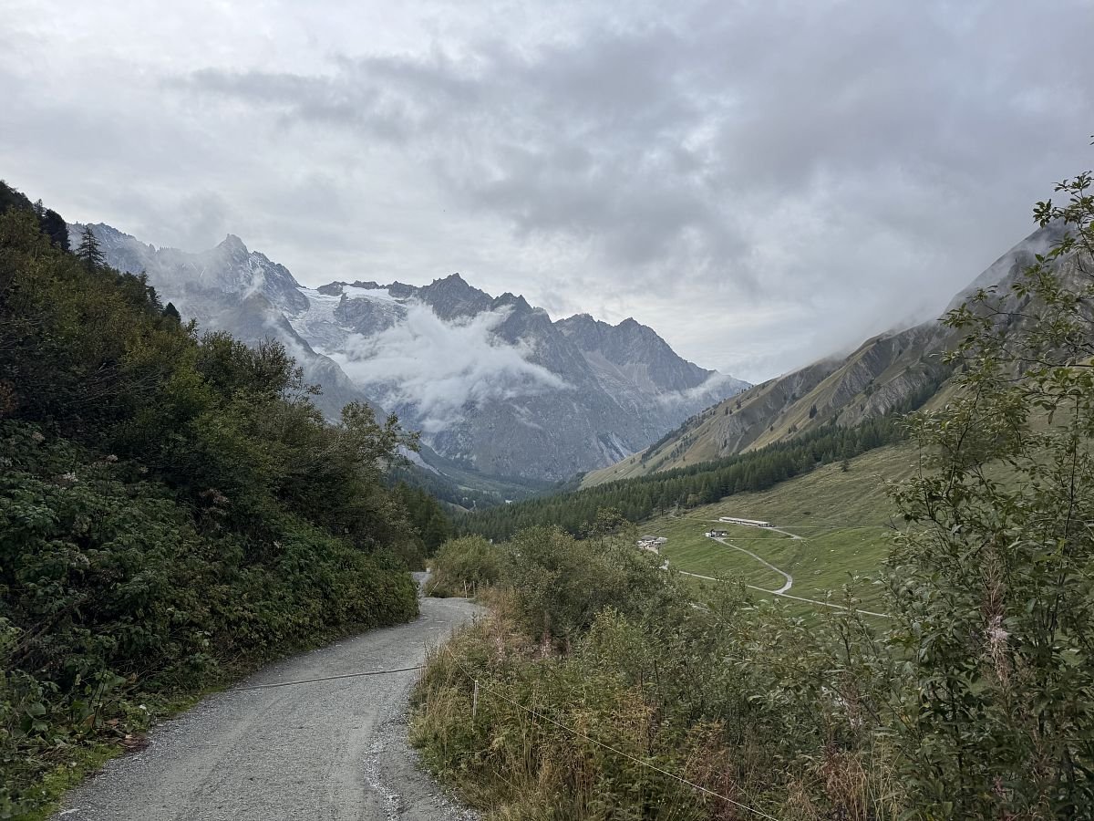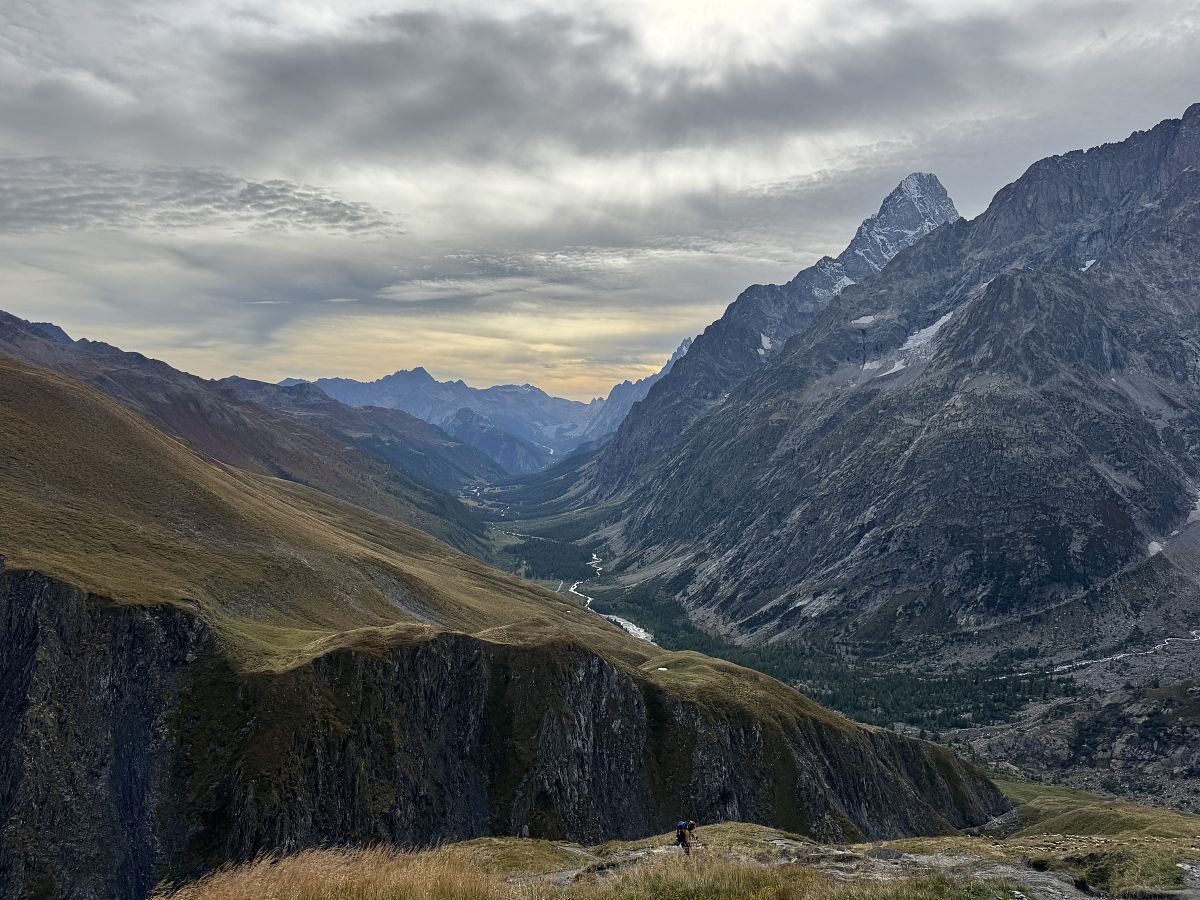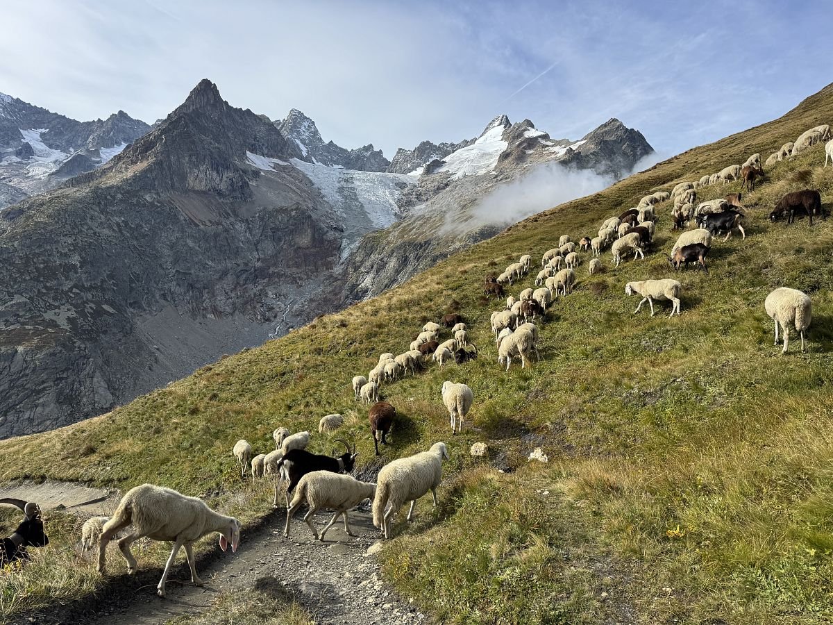 Funíme do kopce, cestou se kolem nás pohybuje stádo ovcí a koz. Doháníme další 2 trekery a jsme rádi, že nejsme na cestě do Švýcarska sami. Stoupáme a s námi stoupá i mlha a zahaluje vše kolem nás, takže v sedle ve finále téměř žádný výhled nemáme a rovnou začínáme klesat do švýcarského údolí Val Feret. Cesta nám docela utíká, sem tam na nás z mlhy začínají opět vykukovat horské masivy a my zas postupně začínáme cítit naše kolena. Míjíme další chatku - La Peule, kde už jsou dnešní přespávači ubytovaní, koukáme na hodinky a rozhodujeme se nasadit rychlejší tempo a zkusit stihnout autobus dole v údolí, který by nám ušetřil nepříliš záživné (obzvlášť v tomto počasí) 2-3 km v údolí.