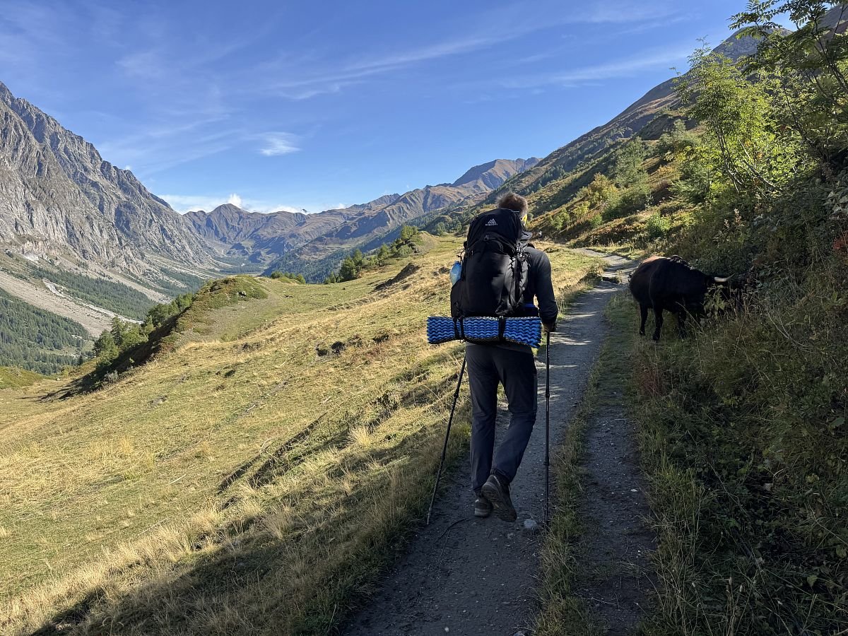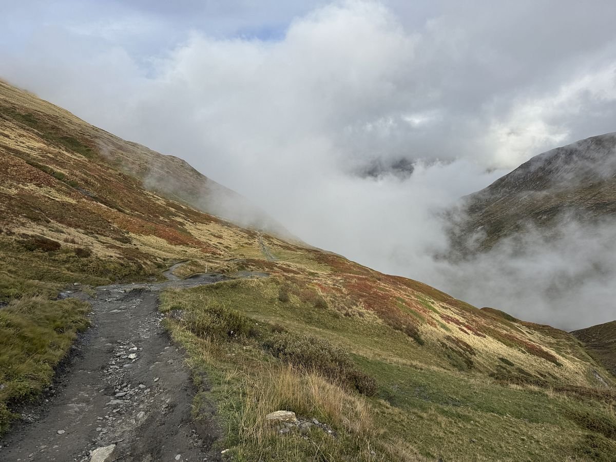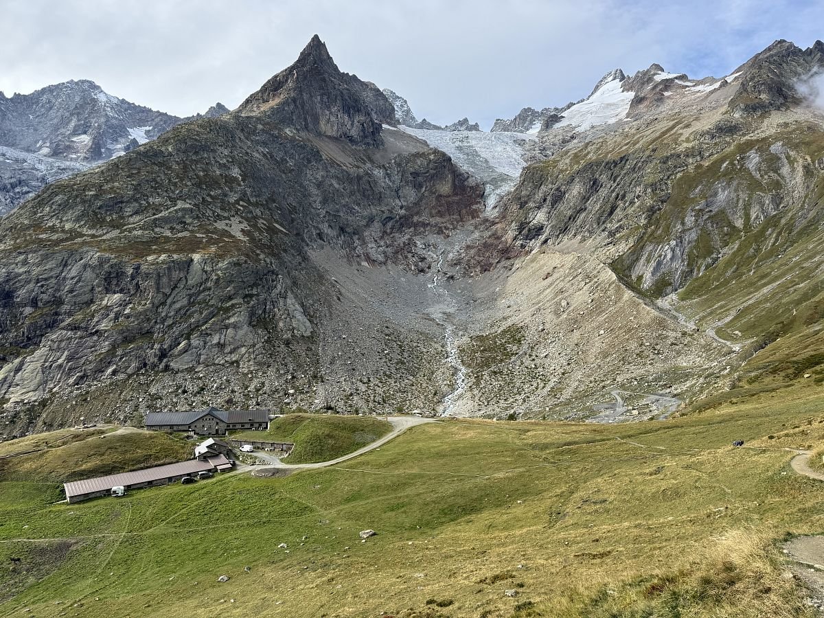 Funíme do kopce, cestou se kolem nás pohybuje stádo ovcí a koz. Doháníme další 2 trekery a jsme rádi, že nejsme na cestě do Švýcarska sami. Stoupáme a s námi stoupá i mlha a zahaluje vše kolem nás, takže v sedle ve finále téměř žádný výhled nemáme a rovnou začínáme klesat do švýcarského údolí Val Feret. Cesta nám docela utíká, sem tam na nás z mlhy začínají opět vykukovat horské masivy a my zas postupně začínáme cítit naše kolena. Míjíme další chatku - La Peule, kde už jsou dnešní přespávači ubytovaní, koukáme na hodinky a rozhodujeme se nasadit rychlejší tempo a zkusit stihnout autobus dole v údolí, který by nám ušetřil nepříliš záživné (obzvlášť v tomto počasí) 2-3 km v údolí.
