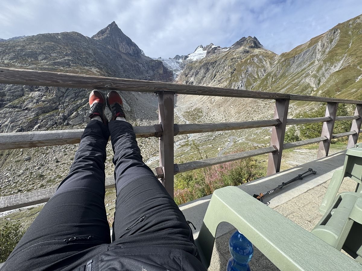 Po pauze vyrážíme dále. Trochu stoupáme a pak zase hodně klesáme až do údolí. V dálce se nám ukáže už další záchytný bod - Refugio Elena. Stoupáme dál, je to trochu úmorné, ale nakonec přeci jen, a ne za tak dlouho, vyšplháme k Eleně, kde si dáváme voraz na křesílkách a tyčku. Nicméně není čas ztrácet čas a tak se vydáváme vstříct nepřijemně vyhlížejícímu stoupání do sedla Grand Col Ferret na italsko-švýcarských hranicích.